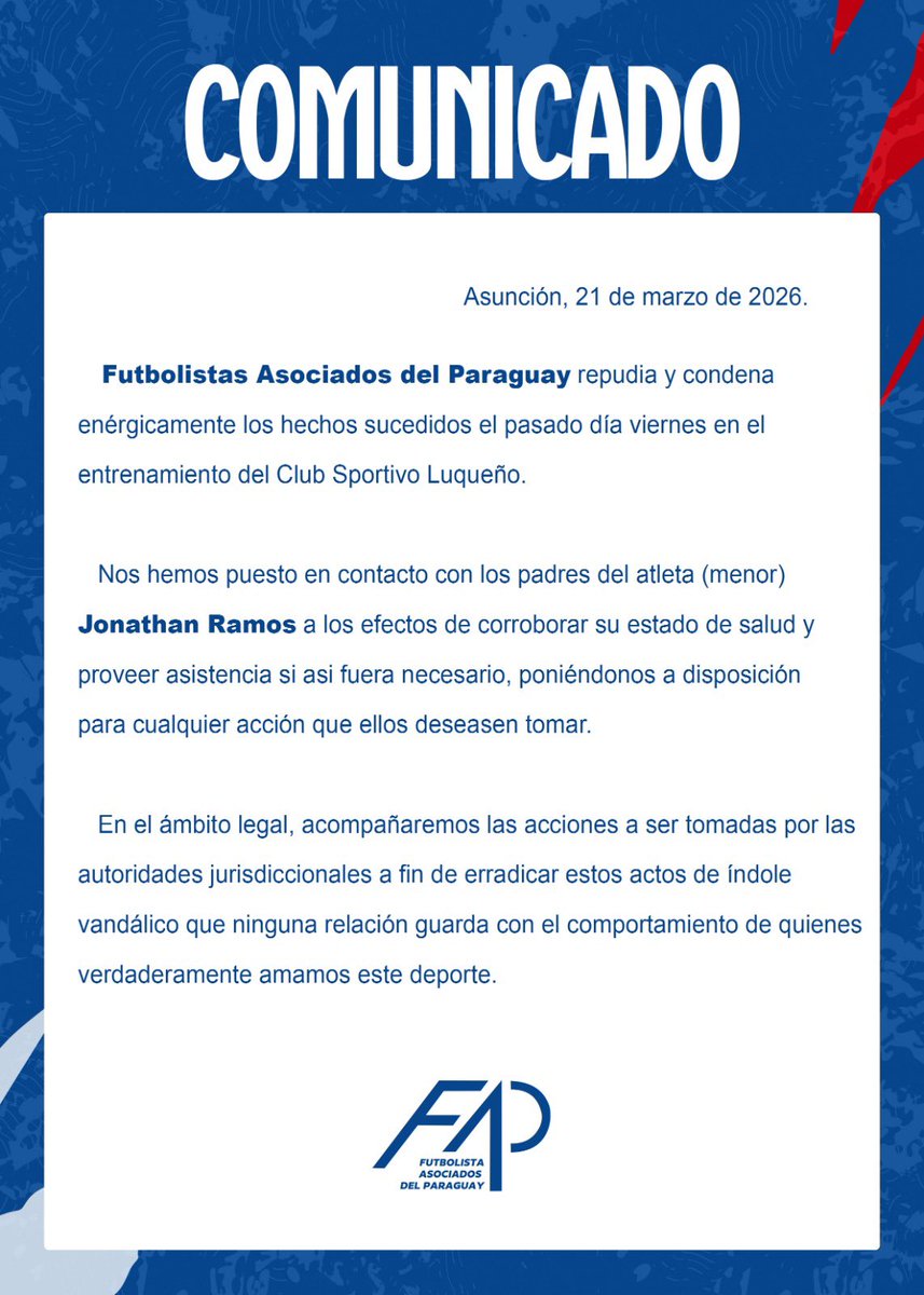 ⚽️ Comunicado de Futbolistas Asociados del Paraguay 🇵🇾 sobre lo ocurrido en las últimas horas con los jugadores del Sportivo #Luqueño y el ataque por parte de sus hinchas. FAP se puso en contacto con los padres del jugador Jonathan Ramos, menor de edad, y se encuentra a disposición para las acciones que la familia desea tomar.